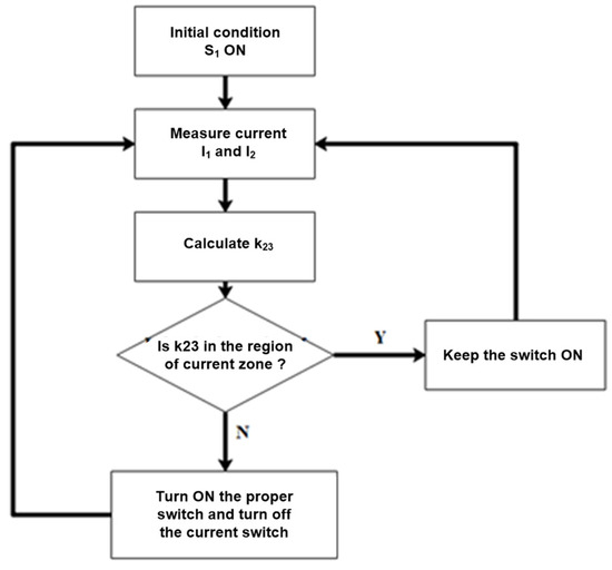 Figure 5 illustrates the power-transfer-ratio versus the curves of the system within three operating zones. If the value of is between and , Zone 2 is selected. Zone 3 is selected when is smaller than . Conversely, Zone 1 is selected when is larger than . The intersections of the curves represent the condition under which the system should change from one zone to another. Practically, it is important to deduce the value of by only using the information at the transmitter side. The transmitter coil is fixed with the repeater coil, so can be measured. The equations for the system operating at the resonant frequency can be simplified to (13). Rewriting (13) gives in terms of and as shown in (14). and are the root-mean-square currents of the transmitter and repeater coils. Then, can be calculated by (2), and the optimum operating zone can be selected accordingly. The flow chart of the control method is shown in Figure 6.