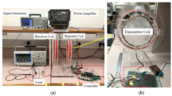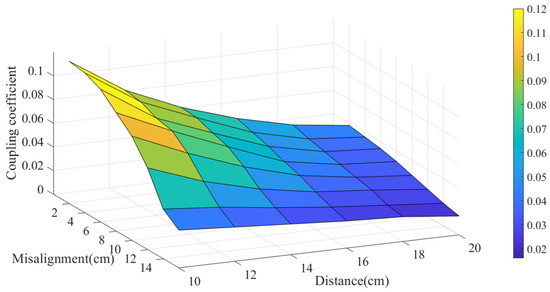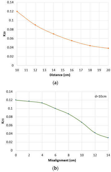 A proof-of-concept prototype was built to verify the performance of the proposed system (see Figure 7). A function generator (Tektronix AFG3102C) and a high-speed bipolar amplifier (HAS 4101) were used to provide an AC voltage source generating a sinusoidal wave with constant frequency and magnitude. The size of the repeater coil and the receiver coil were the same, each with a 10 cm radius in a helical structure. Litz wires were used to reduce the AC resistance in the coils. The number of turns of the coils was nine. The Q-factor of the coils reached 527 when the operating frequency was 585 kHz. All the parameters of the repeater coil and the receiver coil are shown in Table 1. The relationship between and transmission distance is shown in Figure 8a. The varied from 0.12 to 0.038 in the range of 10~20 cm. The value of versus the lateral misalignment from the center of the coil was also measured at the transmission distance of 10 cm. It varied from 0.12 to 0.036 with the misalignment from 0~14 cm, as shown in Figure 8b. A 3D plot of k23 versus both dimension changes is shown in Figure 9.