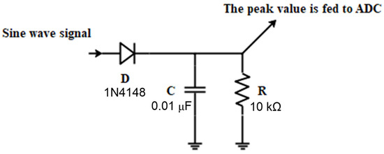 Using Coilcraft current sensors CS1100L, the current waveforms in the transmitter and repeater coils were sensed. A peak detection circuit, as shown in Figure 11, was constructed to obtain the magnitude of the currents (i.e., and ). The rms values of the currents were calculated by a DSP TMS320F28069 from Texas Instruments. In order to remove the voltage ripple in the peak detection circuit, a digital averaging filter was applied. The DSP executed the calculation of Equation (14) to determine the best choice of transmitter coils. High-frequency relays TE 1462050-1 from Axicom were used to switch between various turns of the transmitter coil.