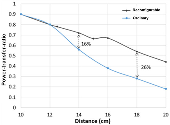 The magnitude and frequency of the AC power source were 12 V and 584.7 kHz, respectively. In the first experiment, the power-transfer-ratio over the distance was measured from 10 to 20 cm without lateral misalignment. Figure 12 shows the power-transfer-ratio from the transmitter coil to the receiver coil when the system was operated in three different operating zones. It can be observed that the PTR-to-distance curve of Zone 3 is flatter than Zone 1. This is because the Q-factor of the transmitter coil in Zone 1 was approximately three times higher than in Zone 3. The system changed the operating zones at the two intersection points, a and b, which were around distances of 12.5 cm and 15 cm, respectively. At point a, the transmitter coil changed from four turns to three turns to reduce k12 and M12 to adapt the transmission distance. It is clearly shown that the power-transfer-ratio of Zone 2 is higher than Zone 1 after point a. At point b, the transmitter coil further changed from three turns to two turns to maintain a high power-transfer-ratio. A combined system PTR-to-distance curve with DSP control was measured, and it is compared with the ordinary three-coil IPT system in Figure 13. It can be observed that the power delivery of the proposed system was significantly improved over a long distance. At distances of 14 cm and 18 cm, the power delivery was improved by 16 % and 26 %, respectively.