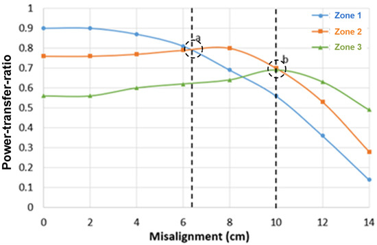 Measured power-transfer-ratio from the transmitter coil to the receiver coil versus misalignment in three operating zones.