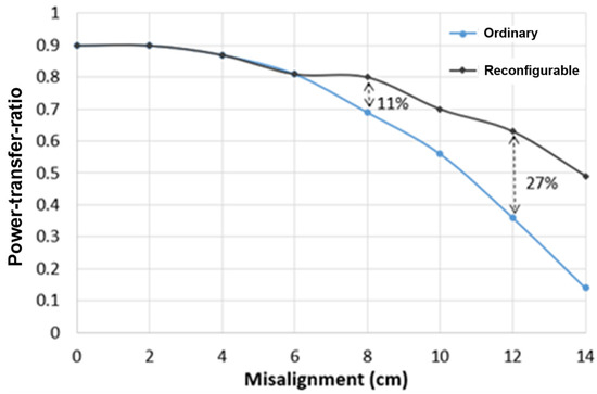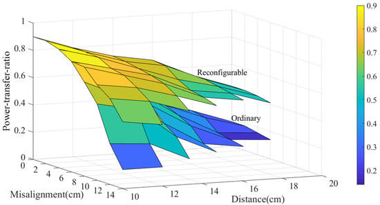 In a conventional three-coil IPT system, only changes in (5) when the transmission distance varies or misalignment occurs. Thus, the decreases correspondingly, as indicated in (9). The proposed system would have selections of , and when changes. The system will automatically select the optimum values of , and to maintain the value of , resulting in a higher power delivery than the conventional system.