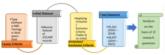 In order to conduct the bibliometric assessment, Web of Science (WoS) is used to acquire our required dataset for the years 2016–2021. The dataset is acquired from the WoS Core Collection. The ISI WoS is one of the most commonly used electronic databases provided by Thomson Scientific’s Institute for Scientific Information [33] to perform bibliometric assessment which is also evident from Table 1. The initial dataset comprised 210,640 records for the query (Software AND Testing). However, refinement on the basis of topic is performed by selecting the topic while giving “Software AND Testing” as input in the query field. This is to ensure that all the articles included in the dataset are relevant to the topic of ST. Further refinement of datasets is carried out on the basis of inclusion/exclusion criteria as presented in Table 3. A complete methodological process is shown in Figure 1 for the formation of two distinguished data sets having 35,161 records for the years 2016–2018 and 39,937 records for the time frame 2019–2021.