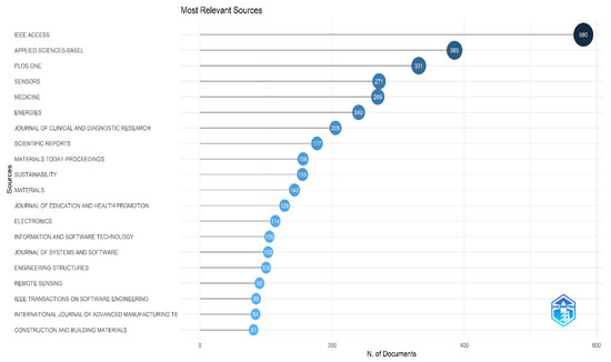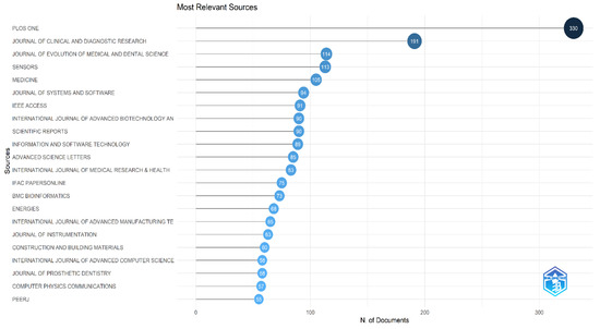 The top 20 publication venues (sources of publications) for the two different time frames are shown in Figure 3 and Figure 4. Figure 3 represents the top 20 publication venues for the time frame 2016–2018. During this time frame (2016–2018), the data set comprises a total of 12,090 publication venues whereas the total number of publication venues for 2019–2021 added up to 10,558. Figure 3 consists of more than 20 entries because multiple publication venues have the same number of publications, so they occupy the same position in the top 20. The darker the blue color is (in both the figures: Figure 3 and Figure 4), the greater the number of publications these sources (publication venues) have.