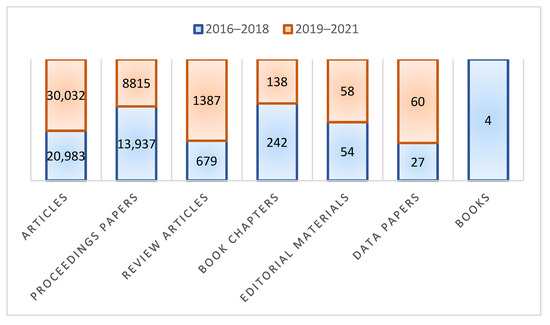 Types of Documents published during time spans 2016–2018 and 2019–2021.