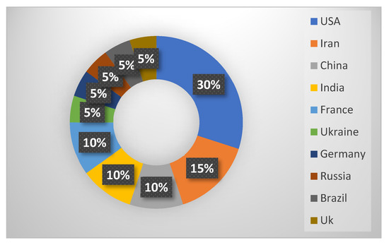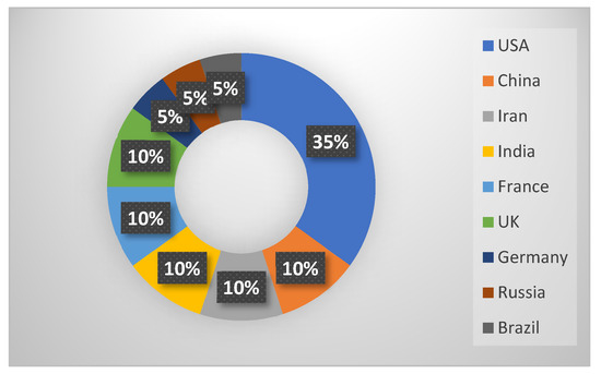 Throughout both the time frames, we analyzed that most publications were contributed by scholars having an affiliation with the Islamic Azad University, Iran. However, the USA leads in the number of institutions/organizations present in the top 20, followed by Iran, China, France, and India. The number of institutions/organizations in Table 9 and Table 10 belonging to a specific country is shown in Figure 6 and Figure 7 below.