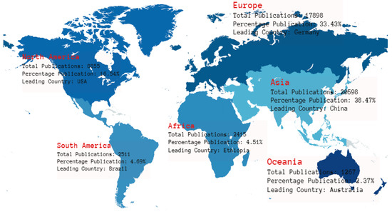 The continent-wise research contribution as per the record count of published studies is shown in Figure 8 and Figure 9 for the years 2016–2018 and 2019–2021. It is to be noted that in the case of multi-authored documents, contributions of all countries based upon authors’ affiliations are considered.