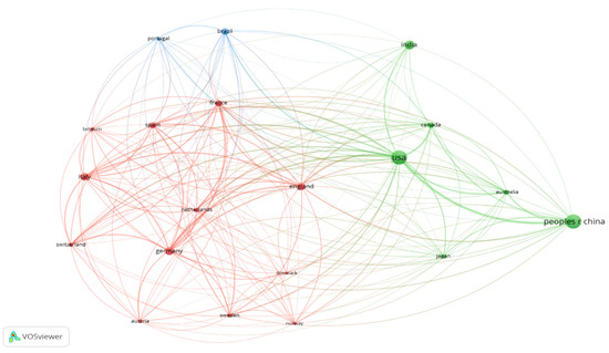 The frequency of collaboration varies widely according to the scientific topic and discipline. Collaboration is very crucial for quality and timely research study in any field [23]. We used VOSviewer to conduct our study survey because it allows us to examine collaborative networks between countries. The circular elements (referred to as nodes) in VOSviewer represent a unit of analysis, and lines between nodes indicate that the respective two nodes collaborated on a research study. The weight of nodes is reflected in the size of the nodes. The weight of a node increases as its size increases. Greater weights, in this situation, indicate more collaboration for that specific country. Countries associated with each other very closely in terms of research studies belong to the same cluster and result in the formation of multiple co-authored research documents. Research Associativity is not only limited to intra-cluster collaboration, but is also extended to inter-cluster collaboration. However, the intra-cluster constitutes the countries collaborating with each other in a much more frequent manner. For the dataset 2016–2018 and 2019–2021, the minimum number of documents per country is selected to be 1. This results in a total of 169 countries for the dataset 2016–2018, whereas it results in 176 countries for the dataset 2019–2021. However, to enhance visibility, the top 20 countries are selected to represent the research collaboration network as shown in Figure 10 and Figure 11 for the time spans 2016–2018 and 2019–2021 respectively.