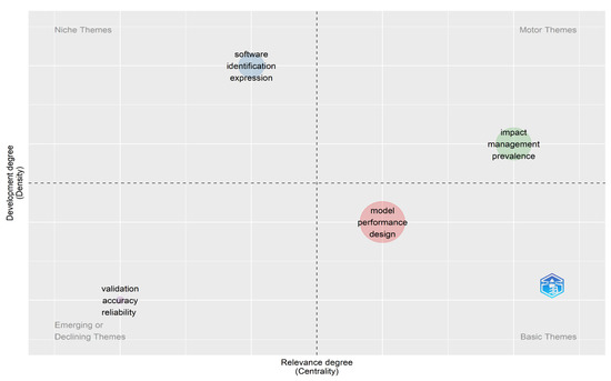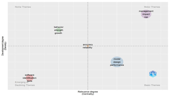 All the co-words that are more frequently used with one another are presented in one cluster. These clusters provide a ground for the identification of research themes/topics. For cluster 1, the word with highest number of occurrences for the time spans 2016–2018 is “model” and for 2019–2021 is “performance”. For cluster 2, the term “software” is the most common terminology for both the time spans. Cluster 3 shows that for the time frame 2016–2018, the term which has the highest occurrences is “management” and for the time duration 2019–2021 it is “impact”. Table 15 and Table 16 depict that the keywords which belong to cluster 1 generally have a greater number of occurrences as compared to the other two clusters. Furthermore, it also highlights the fact that any software that is being developed or is under development is incomplete without Software Testing as the keyword “Software” has the highest weight (Figure 13 and Figure 15) and the number of occurrences (Table 15 and Table 16) in the publications related to the field of ST.
