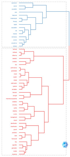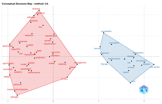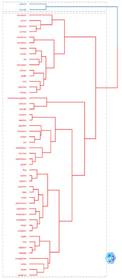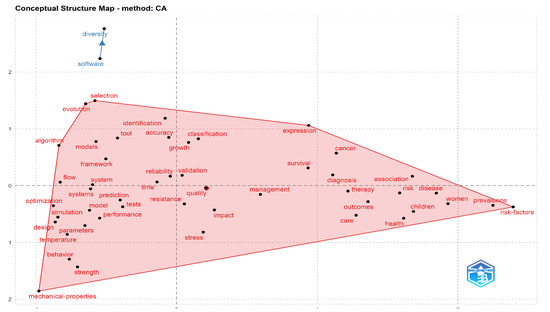 A two-dimensional diagram known as a “thematic map” depicts typological patterns [36]. The co-word analysis identifies keyword clusters, which in turn generate themes for research topics as shown in Figure 16 and Figure 17 for the years (2016–2018) and (2019–2021) respectively. These themes can be divided into four quadrants on a two-dimensional graph on the basis of their density and centrality, which are the two dimensions of the graph. A bubble represents a theme on the map. including the first quarter (top right area): motor themes, a significant research concept that is getting momentum; The second quarter (top left area) contains highly evolved and isolated elements that have been well developed but are currently niche research issues; emerging theme in the third quarter (bottom left area): contains a study topic that has recently emerged or is on the verge of disappearing. The fourth quarter (bottom right side) contains the following information: basic elements, which are critical to the area, have not been extensively developed and often allude to major research topics [37]. Correspondence Analysis (CA) is a multivariate graphical tool that is used to investigate correlations between category data as shown in Figure 18 and Figure 19 for the two respective timelines (2016–2018 and 2019–2021). The hierarchical order and connectivity between the keywords created by the hierarchical classification are represented by the topic dendrogram is represented in Figure 20 and Figure 21 for the time spans 2016–2018 and 2019–2021.