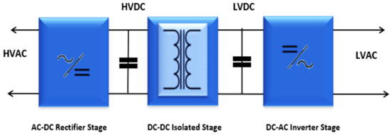 Different topologies for SSTs were explored in [17,18]; SSTs possess different classifications according to the stages, power levels, and applications. The authors [18,20] provided a comparison of one-, two-, and three-step topologies. The one- and two-step topologies have limitations of poor DC link fault tolerance and do not provide modularity. Figure 1 shows the three-stage SST topology, as this setup supports modularity in structure.