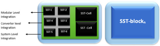 Figure 2 illustrates the different compositions of solid-state transformers, such as module level, converter level, and system-level integrations. A modular SST possesses integrated power module (IPM) and provides different configurations, such as half bridge, multi-level converter and modular multi-level converters.