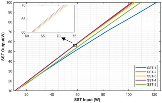Efficiency and loading capability graphs are obtained from [21] and then by using MATLAB curve-fitting tools, quadratic equation constant parameters and the efficiency of each SST at every loading point are obtained. Figure 6 illustrates this efficiency vs. loading behavior at each loading condition.