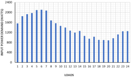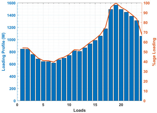 A load profile from [9] is utilized for the optimal distribution of the load among SSTs in Figure 7. Moreover, a 24 h percentage loading profile is obtained by dividing each hour load by its maximum value and is presented in Figure 8. Table 2 provides the loading vs. efficiency equation constants (a, b, c), which are used to find point-to-point data. This efficiency profile will help us to prioritize the most efficient generators to fulfill the load requirements.