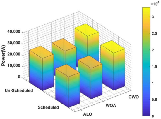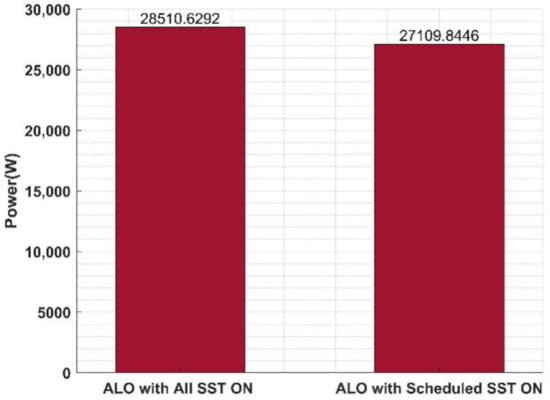 Scenario II: All 16 SSTs are working when 100% load is demanded, otherwise there will be SST scheduling according to the efficiency of SSTs. In this case, a unit commitment strategy is employed on the basis of the efficiency priorities of SSTs. When a load is less than maximum, only the most efficient SSTs are selected for operation. Figure 9 shows a visual illustration of the improvements achieved by using the scheduling of SSTs along with ALO, except the regions where all SSTs are ON, presenting the maximum demands in load profiles. For comparison, Scenarios I and II are utilized to investigate the scheduling effects on SSTs while using the ALO algorithm. This provides a visibly reduced amount of 1417.71539 W input, approximately 1.4 KW for the same amount of load.