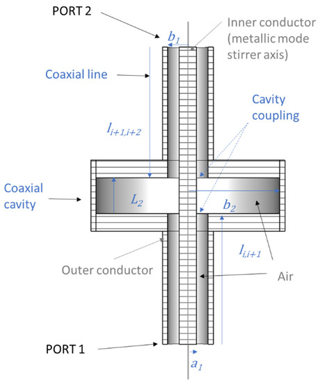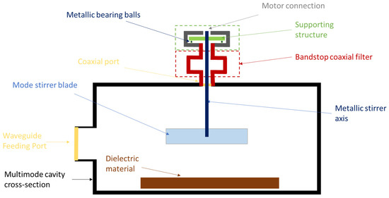 Figure 1 presents the cross-section scheme of a multimode microwave applicator where a dielectric material is heated. Metallic stirrers are typically preferred over dielectric stirrers due to their greater ability to reflect and disperse electromagnetic fields; therefore, a metallic axis capable of supporting the stirrer blades may be required. Unfortunately, because there is no cutoff frequency for the transversal electromagnetic modes (TEM), this metallic axis creates a coaxial port in the cavity wall where it is introduced; thus, bandstop filters are required to avoid leakage of microwave radiation.