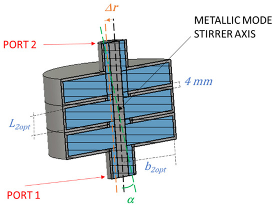 Figure 4 shows an axial section of a structure made up of a 3D coaxial cavity model fed by two coaxial lines. This structure was simulated in the CST Studio Suite, and two coaxial ports were used to excite the structure’s TEM mode. All simulations were carried out using perfect electric conductors (PEC) and vacuum materials. With this bandstop resonator configuration, the metallic mode stirrer axis could freely rotate, as shown in Figure 4. This structure was subjected to parametric sweeps and optimization procedures.