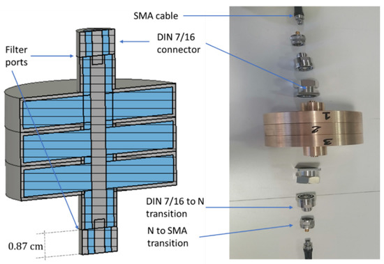 Figure 6 depicts the scheme for connecting the filter port to the DIN 7/16 male connector, as well as the manufactured filter and all of the connectors and transitions used. As shown in Figure 6, the DIN 7/16 connector allowed one to thread its inner coaxial conductor to the stirrer axis and connect the external conductor of the DIN 7/16 connector to the external conductor of the filter’s coaxial port. The N and SMA transitions allowed us to keep 50 Ω while avoiding unwanted reflections. The VNA was calibrated in this manner at the SMA cable connectors using conventional standards and procedures. The intermediate filter (IF) bandwidth was set to 1 kHz, and 10,001 points were used within the frequency range.