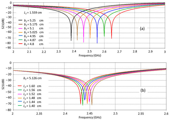 Initially, parametric sweeps in the CST Studio Suite were used to analyze the main design parameters of a single two-port coaxial resonator, specifically the inner radius (b2) and height (L2). Figure 7a represents the variation of the resonant frequency when the cavity height was held constant at L2 = 1.559 cm, and b2 varied from 4.8 to 5.25 cm. Based on the simulations, the higher the b2 values for a given stirrer axis radius, the lower the resonant frequency. In fact, with a 0.45 cm variation in b2, the resonant frequency could vary by more than 250 MHz around the 2.45 GHz ISM central frequency. Figure 7b shows the relationship between resonant frequency and coaxial cavity height (L2). In this case, b2 was fixed at 5.126 cm, while L2 varied [1.4, 1.6] (cm). As expected, larger heights resulted in lower resonant frequencies in the cavity. It should be noted that, as shown in Figure 7a,b, this single resonator provided a minimum attenuation of 20 dB for a bandwidth of 100 MHz, and that at least three stages should be used if a filter with a 60 dB attenuation level was required. Furthermore, based on the results in Figure 7, it is possible to conclude that both L2 and b2 can be optimized to provide maximum attenuation in the 2.4–2.5 GHz ISM band.