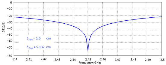 The simulated S21 scattering parameter of an optimized coaxial cavity is shown in Figure 8. The optimal cavity dimensions in this case were L2opt = 1.6 cm, and b2opt = 5.132 cm, which were obtained using the EM software’s Quasi-Newton optimizer after 800 steps, including interpolations. The optimized structure had a maximum attenuation level of about 70 dB at 2.45 GHz and lower attenuation levels of about 20 dB at the ISM band’s extremes.