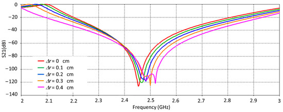Figure 9 demonstrates the three-stage filter’s behavior when the mode stirrer axis remained in an ideal position, Δr = 0, or when it deviated from the filter center, Δr cm, due to unwanted vibrations or swaying, as shown in Figure 5. According to the results in Figure 9, the ideal three-stage filter could attenuate more than 120 dB in the center of the band and more than 70 dB across the entire 2.45 GHz band. The displacement of the stirrer axis, on the other hand, caused an increase in the resonant frequency and a widening of the filter bandwidth. Fortunately, even in extreme cases where the axis almost touched the coaxial port’s outer conductor, the filter provided attenuation levels greater than 60 dB.