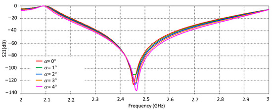 Figure 10 depicts the effect of the mode stirrer axis inclination (α) versus the ideal situation shown in Figure 5. The simulations showed that the greater the inclination angle, the larger the shift of the resonant frequency. Although small changes in the filter bandwidth were perceived, they were less noticeable than those caused by variations in Δr. In this case, too, the attenuation levels were kept above 60 dB for the 2.4–2.5 GHz band.