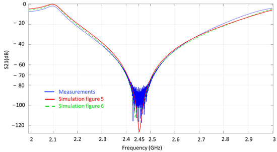 Figure 11 compares the simulation results of the bandstop filter obtained by coupling three optimized coaxial cavities, all with the dimensions L2opt = 1.6 cm and b2opt = 5.132 cm, as shown in Figure 5 and Figure 6, to the measurements performed with the VNA.