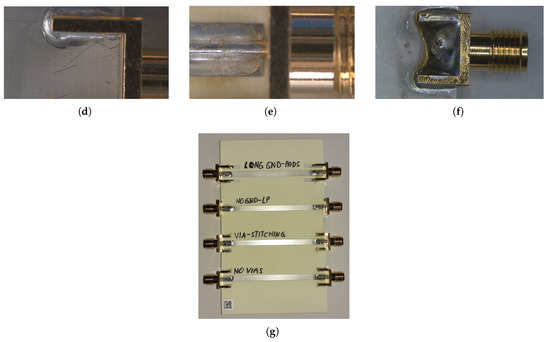 (a) Test PCB 1 and PCB 4. (b) Test PCB 2. (c) Test PCB 3. (d,e) Test PCB 1, PCB 2, PCB 3 and PCB 4 top and bottom view with 150 m ground edge. (f) Solder at the bottom layer to connect the bottom ground metal with the SMA connector body. (g) Complete PCB design. The PCB is connected via coaxial cables to the VNA Keysight PNA-X N5244B.