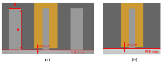 (a) PCB top view of signal launch used in PCB 1, PCB 2 and PCB 4. (b) PCB top view of signal launch used in PCB 3. The values for A and B are listed in Table 1.