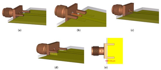 3D models to investigate increased insertion and transmission losses at an SMA-to-microstrip interface. (a) PCB 1 model with ground metal at the top layer (no vias). (b) PCB 2 model with increased length of top ground metal (no vias). (c) PCB 3 with removed ground metal at the top layer. (d) PCB 4 with vias to connect the top and bottom ground. (e) bottom view of PCB designs (a–d). All PBC designs use the same SMA connector model [3].