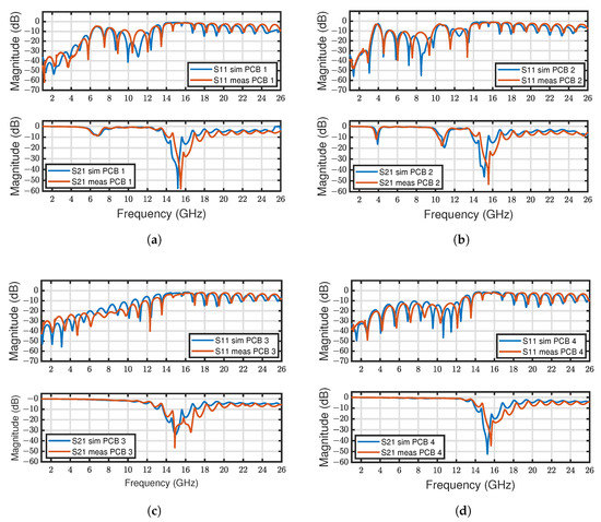 Comparison of insertion and transmission losses of different PCB designs (see Figure 3). (a) PCB 1; (b) PCB 2; (c) PCB 3; (d) PCB 4.