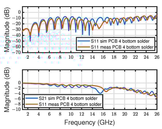 Comparison of insertion and transmission losses of PCB 4 applying solder to connect the bottom ground metal with the SMA connector body (compare Figure 1f).