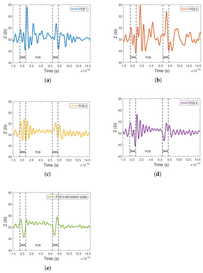 (a–d) Comparision of TDR measurements of PCB 1, PCB 2, PCB 3 and PCB 4. (e) TDR measurement of PCB 4 applying solder to short the PCB edge gap between the ground metal layer and the SMA connector body.