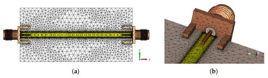 The results presented in this section are obtained by utilizing the finite-element-method (FEM) using tetrahedral mesh cells, as depicted in Figure 8. The excitation is located within the SMA connector, prescribing a coaxial wave guide, as depicted in Figure 9. Considering the results from Figure 10, the dominant source of excess transmission losses might be located at the SMA-to-microstrip interface, hence special attention was paid to discretize the critical region properly, see Figure 8b.