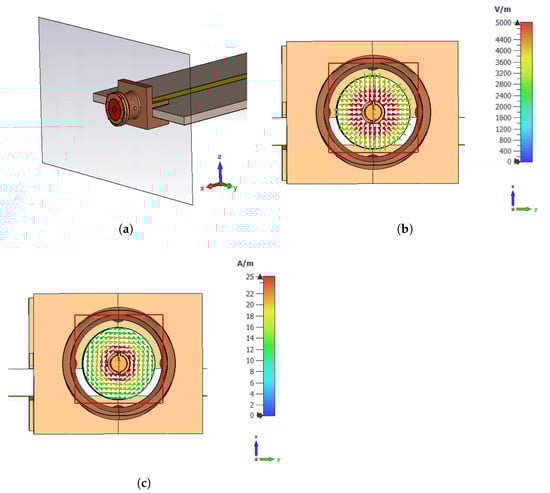 Coaxial excitation at the SMA connector. (a) Location of exciting wave guide port. (b) Prescribed -field at excitation plane. (c) Prescribed -field at excitation plane.