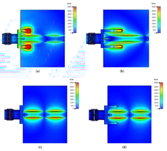 Considering Equation (11) and the electric field distribution at 6.85 GHz, as depicted in Figure 10, one can explain the origin of the excess transmission losses observed at this frequency. As one can see in Figure 10a, the floating top ground pads cause a resonance of the electric field, hence increased losses are occurring. To confirm the origin of these losses another experiment was conducted where the length of the top ground pads is increased (PCB 2). The results for PCB 2 are depicted in Figure 10b. As one can see, the frequency where excess transmission losses are observed is shifted to a lower frequency value (3.782 GHz). Therefore, it can be concluded that the frequency of these transmission losses is determined by the length of the top ground metal. To overcome the problem of signal deterioration below 10 GHz the designs for PCB 3 and 4 are considered. The electric field distributions for these designs are presented in Figure 10c,d. As depicted, PCB 3 and 4 do not exhibit an electric field resonance, therefore there is no performance deterioration observed. From the obtained results one can conclude that floating ground connections must be avoided to improve the signal launch design. The best results in terms of insertion and transmission losses were obtained by connecting the top and bottom ground metals using vias which confirms the reported RF design guidelines presented in [14].
