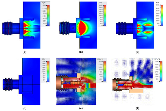Additional to the excess transmission loss at 6.85 GHz, another frequency of excess transmission loss is observed at 15.2 GHz, as depicted in Figure 5. These losses can be attributed to the gap between the PCB edge and the ground metal at the bottom layer, as indicated in Figure 11b. The gap causes a resonance of the electric field, hence considering Equation (11) additional losses are present. The power flow of the SMA-to-microstrip interface is depicted in Figure 11e. By shorting the gap between PCB edge and bottom ground by using a solid tin metal block, one can see that the electric field resonance disappears (Figure 11d), hence an improvement of the performance can be observed, as depicted in Figure 6. This observation is confirmed by investigating the power flow, as depicted in Figure 11f. When a continuous ground connection is established between the SMA connector and the PCB, the second source of excess transmission losses at 15.2 GHz can be prevented. This observation matches the results reported in [4]. The authors in [4], introduce edge plating to overcome the ground discontinuity issues but as shown in Figure 11, it is sufficient to short the gap between SMA connector and PCB ground metal by applying solder in this region. Establishing a continuous ground connection does not only suppress excess transmission losses but also reduces the insertion losses above 18 GHz by approximately 10 dB, as shown in Figure 6e.