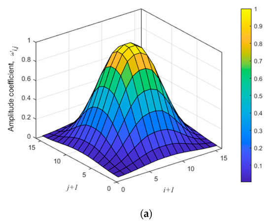 It is noted that the value of ranges from 0 to where the elements located at radial distance have the lowest tapered coefficient while the maximum occurs at the nearest elements to the array center (i.e., ). Therefore, this approach of tapering is called “radial tapering” as it depends on the radial distance from the array center.