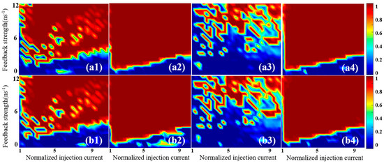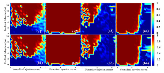 Figure 2 shows the 0–1 chaos test of MSRL, while the X-axis and the Y-axis are the injection current and feedback delay time, respectively. Figure 2(a1,b1,a2,b2) represent the strong feedback , and Figure 2(a3,b3,a4,b4) represent the weaker feedback . We set a small value of linewidth enhancement factor in Figure 2(a1,b1,a3,b3) and a bigger linewidth enhancement factor in Figure 2 (a2,b2,a4,b4). In the cases of weakened feedback strength, the dark red focuses on the left region of the two-dimensional maps, which means that with too big a value of the injection current, the MSRL is not operating in the chaotic region. From Figure 2(a2,b2), we can find that by choosing bigger and , the MSRL outputs chaos in the whole parameter space of (, ), that is to say, the effects of the injection current and feedback delay time on the dynamics of MSRL can be weakened by increasing and .