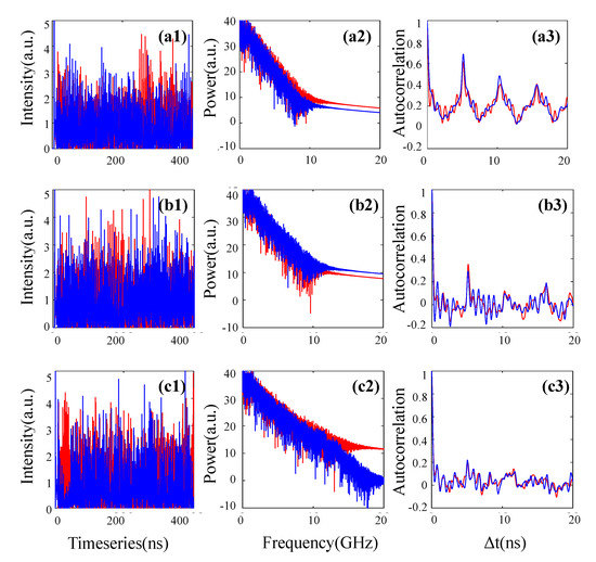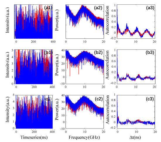 Figure 3 shows the timeseries and the corresponding spectrum and ACF of MSRL for several but different . The feedback parameters are set as the feedback strength , feedback delay time , and current . Under the above conditions, we can find that the MSRL outputs the chaotic fluctuations. In the right row, the obvious peak around the delay time of MSRL, which is extracted by ACF, can be observed. The ACF peak is seen very clearly when ; as increases to 5, the ACF peak is slightly attenuated. Generally speaking, the ACF can be considered effectively suppressed, while the value is less than 0.2. In Figure 3(c3), the chaos TDS is strongly weakened, while . The reason is due to the coupling effect between the amplitude and the phase of the electric fields. Interestingly, as increases, the spectrum of MSRL expands. The TDS value of MSRL is still bigger than 0.2 in Figure 3(c3). Then, we propose a master–slave chaotic system to suppress the TDS in slave SRL (SSRL). Figure 4 represents the simulated results of timeseries, spectrum and ACF of SSRL, while the system parameters are set as: , . The ACF of SSRL is lower than MSRL; for example, in the case of , the value of ACF is 0.67, while the ACF peak size of SSRL is 0.3. The effect of TDS suppression on the injection system has an obviously good performance, while the linewidth enhancement factor of MSRL and SSRL grows to 8, which can be seen from Figure 3(c3) and Figure 4(c3). The ACF value of MSRL is 0.24, and TDS is totally concealed in SSRL. The bandwidth of SSRL is also bigger than MSRL, which can be seen from Figure 4(a2–c2).