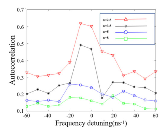 Figure 5 shows the curve of TDS peak size in the variation range of frequency detuning between MSRL and SSRL, where the injection strength is fixed at . In Figure 5, the peak size is defined as the maximum value of ACF during the time window [, ]. From Figure 5, we can find the red line runs on the top and is followed by the black line, the blue line and the green line, which means higher leads to better TDS concealment in SSRL. In the case of smaller , i.e., the red line () and the black line () in Figure 5, the peak size becomes substantially larger with the condition of small frequency detuning, i.e., . The value of the ACF peak size is less than 0.2 over the whole range of , while the SRLs have large , i.e., the green line () in Figure 5, which means the large widens the choice of for the purpose of hiding TDS.