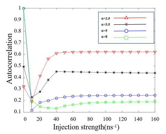 Next, we study further the influence of on TDS concealment during the range of in Figure 6, while the is fixed at . In Figure 6, we can find that the trends for ACF peak size of SSRL in different are the same as the results of Figure 5, and larger is favorable for suppressing the time delay signature of SSRL over a wide range of injection strength. It is interesting to find that the MSRL and SSRL can achieve chaos synchronization when the injection strength is large enough.