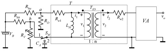 Let us now assume that the switch SW in Figure 2 is in position two. In this situation, because of the presence of the capacitor in series with the primary winding of the transformer, no DC current can flow through the transformer, and this means that the resistances Rbb and RV are no longer required. In other words, with the switch in position two, the bridge configuration is no longer necessary. With the same approximations made for obtaining Equation (2), we can obtain the PSD of the noise at the output of the circuit in Figure 2 when the switch SW is in position two as follows:
