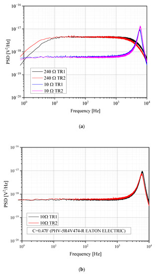 For fMIN = 1 Hz and the worst case of LM2 = 10 H, the CA value must be much larger than 2.5 mF. It can be conveniently obtained by resorting to supercapacitors with hundreds of mF or more capacitances. We selected a good quality 0.47 F supercapacitor (PHV-5R4V474-R EATON ELECTRIC) characterized by a low equivalent series resistance (ESR) of 0.3 Ω at 1 kHz and 0.4 Ω at 100 Hz. We repeated the measurement with a 10 Ω resistor as a DUT using a circuit in Figure 2 without bias (without VB and Rba). As shown in Figure 3b, we obtained the same results as in Figure 3a, which demonstrates that the presence of the supercapacitors does not modify the system’s performances in terms of background noise and frequency response down to 1 Hz.