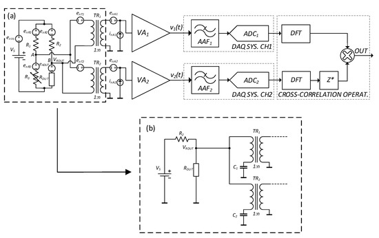 The minimum value of fP1 that can be obtained (with negligible small RD and RV) depends on the transformer, and it is proportional to the ratio between the primary winding resistance and the magnetization inductance. For the same wire and core cross section, the magnetization inductance is proportional to the number n1 of primary turns squared, while the resistance is proportional to n1. This means that increasing the number of turns results in a decrease in the cut-in frequency. However, the fact that increasing the number of turns results in an increase in the resistance and hence in the background noise means that we should increase the magnetization inductance without increasing the resistance. This, however, may result in a significant increase in the size of the transformer (larger section for the wires) that, besides being problematic in itself, also results in an increase in the parasitic capacitances that reduce the higher frequencies at which the system can be usefully employed. Since the noise generated by the secondary winding is divided by n2 in Equation (2), the main contribution to the background noise of a transformer-coupled amplifier can be reduced to the noise introduced by the primary winding and by the resistance RV. In a recent paper [19], it has been demonstrated that by applying the cross-correlation approach to a pair of nominally identical transformer-coupled amplifiers, the contribution to the BN by the transformer winding resistances can be greatly reduced so that the main contribution to the background noise remains the one introduced by the resistance RV. Note that RV also contributes to an increase of the cut-in frequency fP1. In conclusion, we can observe that the presence of RV, while necessary for obtaining a null DC voltage at the input of the transformer (the voltage between nodes a and b in Figure 2), has serious drawbacks as it sets the minimum level of the background noise of the system. Moreover, it also limits the bandwidth of the system at low frequencies, not to mention the amount of time and effort that is wasted any time the bias on the DUT is changed and the value of RV has to be recalibrated accordingly.