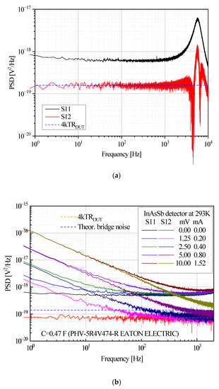 Noise measurements obtained using supercapacitor’s configuration of 10 Ω resistor (a) and InAsSb IR photodetector for few bias voltages (b). S11 is power spectra density obtained without cross-correlation, and S12 is the modulus of the cross-correlation.
