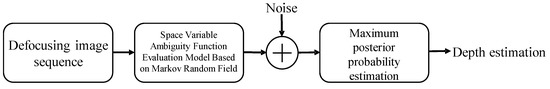 We established the maximum posterior probability depth estimation model of a Markov random field (MRF) [33]. As shown in Figure 1, it is assumed that the MRF can express the defocused image and its blur parameters. Then, the blur parameters and the focused image are smoothed to improve the depth estimation quality. Thus, given two defocused images, the depth estimation and focus image restoration constitute the maximum a posteriori probability estimation problem.