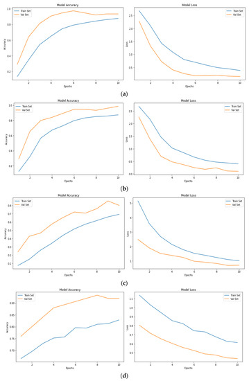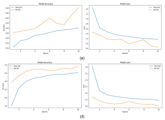 The accuracy value represents the performance of the model. In general, the loss value represents the sum of errors in the model. A good model should exhibit lower loss and higher accuracy. From Figure 3a,f, it is understood that the lowest loss and highest error are achieved in the Inception V3 model. This best accuracy is obtained due to label smoothing, 7 × 7 convolutions, and auxiliary classifier features of the Inception V3 model.