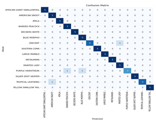 The confusion matrix obtained by the Inception V3 model with data augmentation is shown in Figure 4. The result shows that out of 15 classes, 12 classes were correctly classified, whereas images in 3 classes such as a crescent, purple hairstreak, and tropical leafwing were wrongly classified by the Inception V3 model.