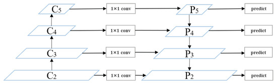 In FPN, the image is down-sampled by CNNs to obtain , and the feature maps {, , } are generated by the up-sampling of . The bottom-up feature map has accurately localized information because they are subsampled fewer times, so the feature maps are generated by the up-sampling of and would fuse with the bottom-up pathway to enhance their position information. However, the dimension (the number of channel) of {, , , } is {256, 512, 1024, 2048}, and the dimension of {, , , } is {256, 256, 256, 256}; therefore, the 1 × 1 convolution is used to reduce the dimension of {, , , } before the fusion of the two pathways.
